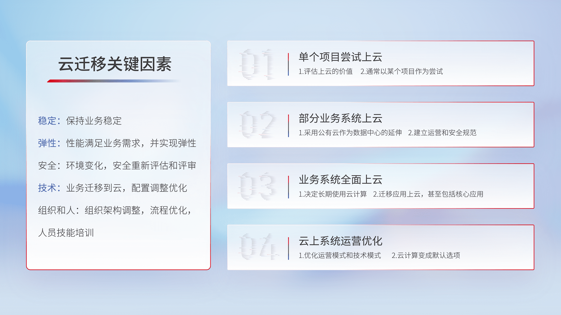 结合实际业务,,,从规划设计、、云平台选型、、云原生改造、、、数据迁移、、、集成交付,,,,迁移全过程为客户识别最佳上云路径,,做好风险识别管理,,设计网络架构、、、身份权限、、安全审计合规、、、操作审计、、日志审计、、监控告警策略、、、、多站点容灾设计等,,,,对云上基础设施进行整体规划,,提升IT治理水平,,,以满足弹性、、高可用、、、、高性能的需求。。。