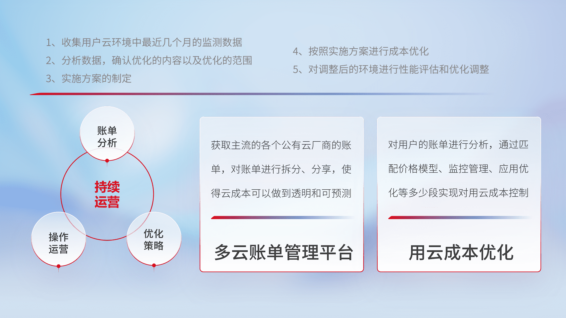 通过多云纳管,,,,以统一的资源数据模型把客户的云资源进行抽象和封装,,,,进而实现对多云资源的统一操作,,,保障云资源管理的可靠性、、、、稳定性与可用性。。。量身定制化运维内容,,,配置、、、、开发运维、、补丁管理、、、备份、、监控、、、认证和访问管理、、审计和日常巡检等,,保障在用云过程中的可靠度,,,稳定度以及高可用率。。。