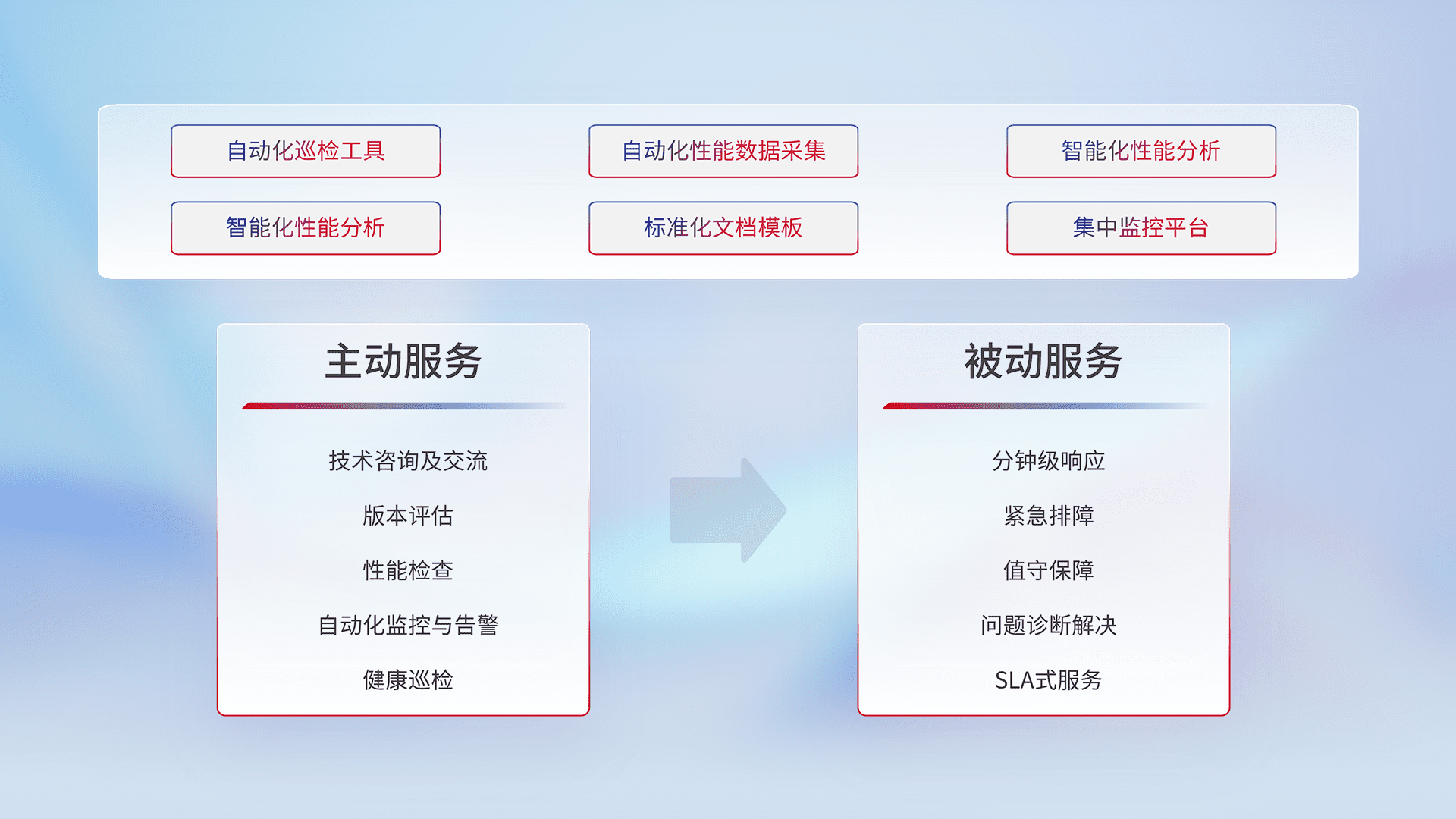 智能化工具和标准化文档,,保障服务质量,,,,提供主动服务(包含技术咨询、、版本评估、、、性能检查、、、、自动化监控与告警、、、、健康巡检)和被动服务包含(分钟级响应、、紧急排障、、、值守保障、、问题诊断解决、、、、SLA服务)。。